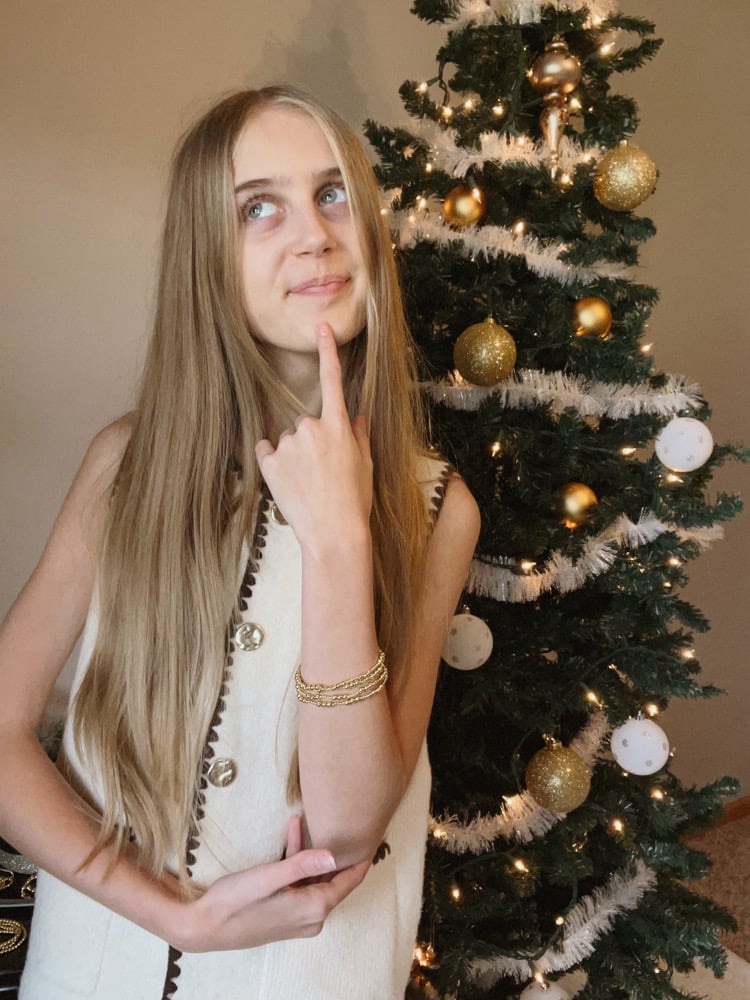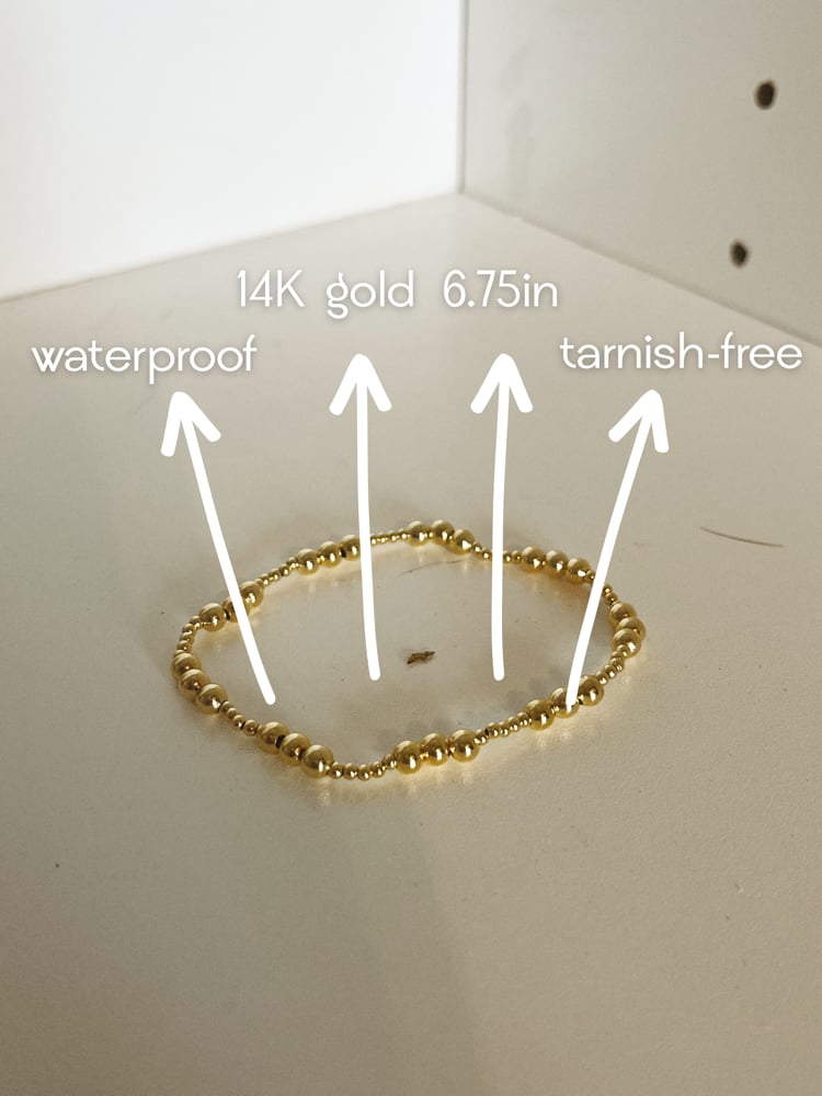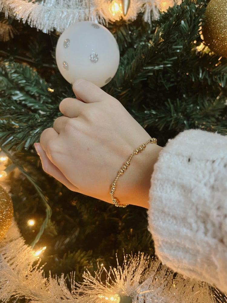Soft gold beads with that cozy, warm tone that reminds you of December nights and quiet moments by the tree. It makes your wrist look effortlessly elegant. A small detail that somehow changes the whole vibe.
